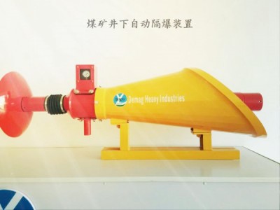 煤矿井下自动隔爆装置采用锚杆固定的方式固定在巷道顶板上。当井下发生爆炸时形成空气冲击波和火焰,这个阶段冲击的传播速度远远大于火焰的传播速度。当冲击波到达冲接收板,机械脉冲通过锚杆传到锁紧装置并且在12ms内引发灭火粉的喷发。只用120ms的时间在巷道中形成了浓度为110g/m3、长度超过30m的可靠的灭火粉雾状区域。并无盲区布满整个保护区域,此雾状区域阻碍并扑灭火焰锋面,能迅速使爆炸在巷道中的传播过程停止。本装备可用于有瓦斯或煤尘危险的矿井,主要隔绝或阻止爆炸传播,防止二次爆炸造成更大伤害,有效可靠减少爆炸损失,降低人员伤亡。